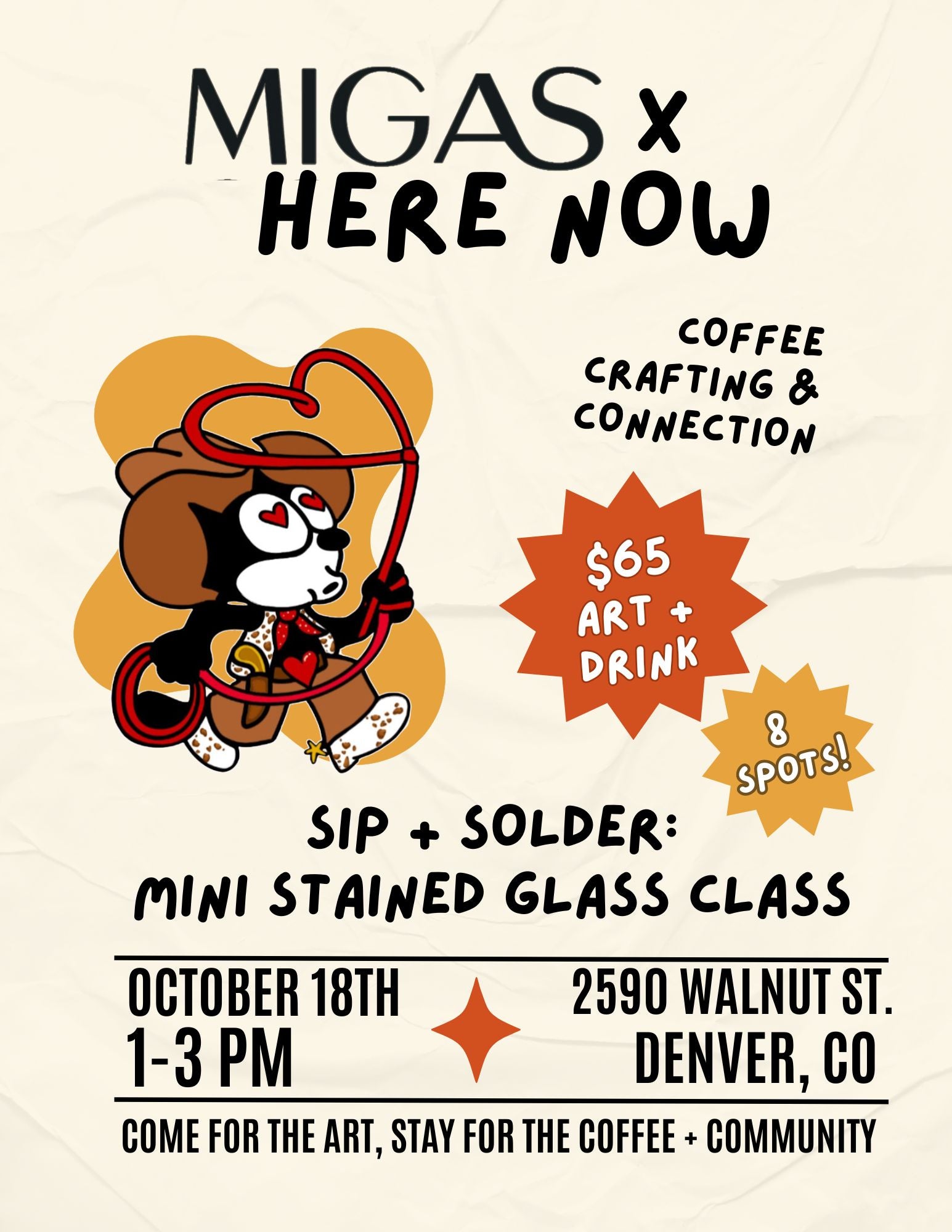 Come vibe, create and connect as we dive into the magical realm of stained glass while enjoying Migas new fall menu! In this pop up class we will cover the basics of stained glass crafting, get hands on experience foiling + soldering and leave with your very own unique stained glass pumpkin. All materials and tools provided +1 beverage from Migas.
